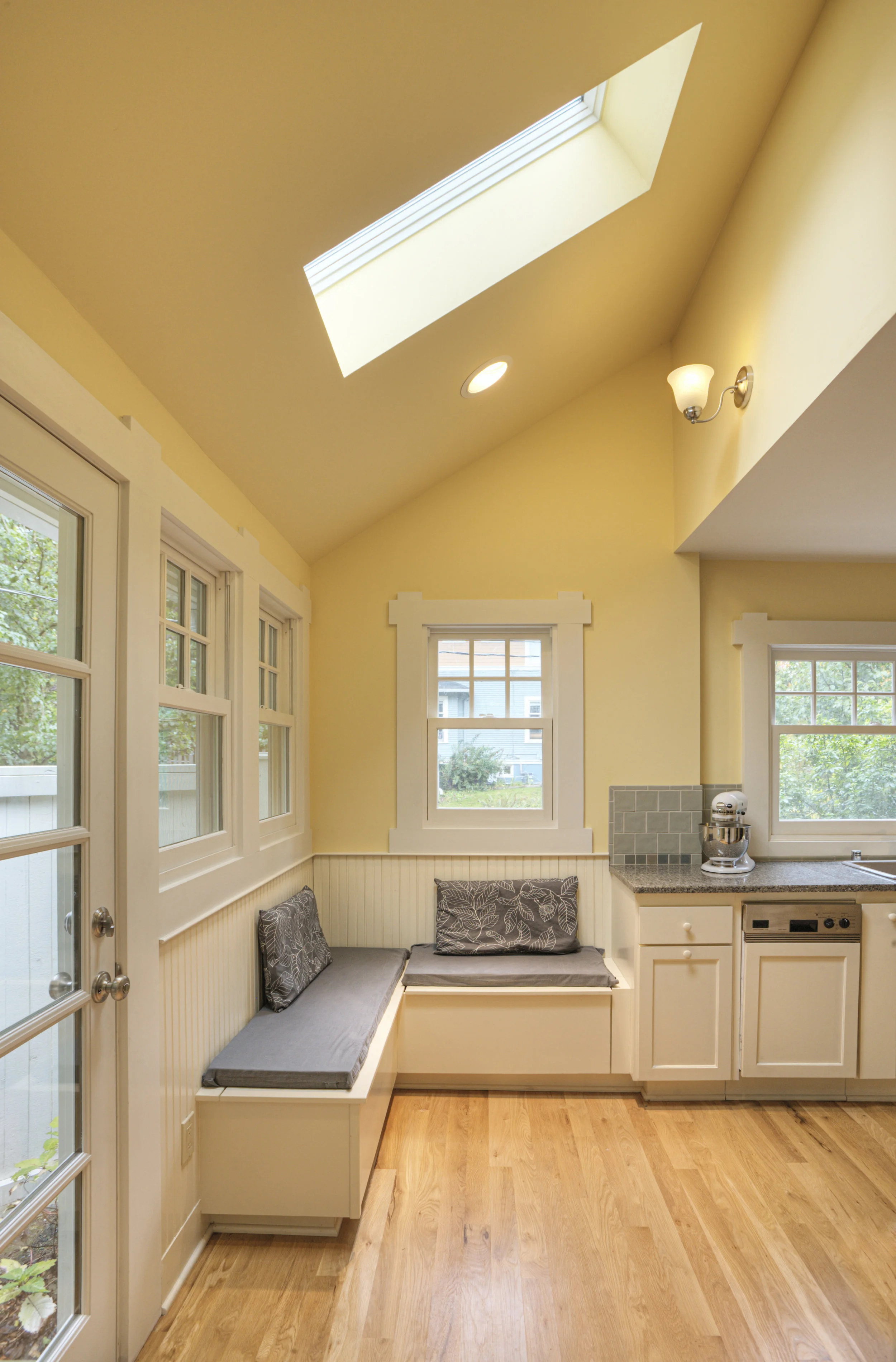 This jewel of a small house on a small lot was doing a good job housing its occupants, but with the prospect of a baby on the way, the small dark kitchen with nowhere to sit, was going to make life difficult. A tiny addition made all the difference. We made it look like it was always there, saving a glass cabinet, and adding new ones knitted in with the old. Now a new eating nook provides a family hangout. The south facing doors that lead to the patio, and the skylights flood the kitchen with light, and make a welcome contrast with the coziness of the rest of the house.