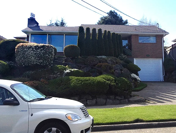 The house was close to a designated steep slope that has a fantastic view, perfect for an outdoor patio, but the central entrance to the house bisected the front yard reducing its potential patio space to half of what it could be. Further, the front door opened onto a view of the bathroom. We moved the front entrance to the side of the house to maximize the private patio and separate it from the front entrance, which was very challenging due to the topography but allowed the front door a view of the fireplace and a spectacular view of Seattle.